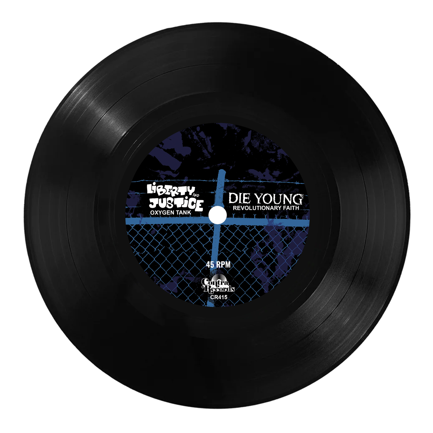 The Die Young split vinyl record features Liberty & Justice’s "Oxygen Tank" and Die Young’s "Revolutionary Faith," pressed on black vinyl with a blue/black label, plays at 45 RPM, limited edition Crucial Chaos CR416.