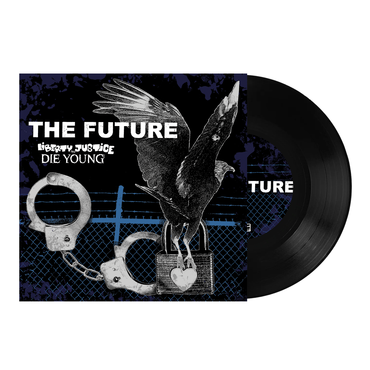 A limited split vinyl from Die Young features a black crow on a fence with handcuffs, set against a dark, grungy backdrop. The cover channels Texas punk and metallic hardcore with bold white text: THE FUTURE, LIBERTY & JUSTICE, DIE YOUNG.